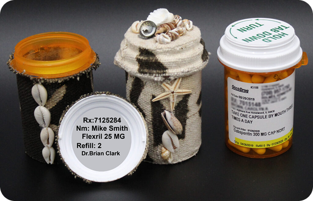 Rx Tribal Wraps are fabric-wrapped prescription pill containers that conceal labels while maintaining full usability.